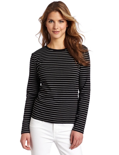Jones New York Women's Petite Long Sleeve Striped Crewneck Top, Black/Sugar, Large
